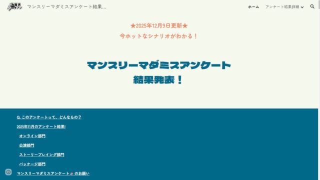 マーダーミステリー予約・レビューサイト「マダミス.jp」で実施されているアンケート企画「#毎月マダアン」の、2025年5月の人気投票結果が公開された。2025年6月には、344名から合計1,272件の回答が寄せられたという。オンライン部門、公演部門、パッケージ部門、ストーリープレイング部門の4部門について、それぞれの集計結果が発表されている。